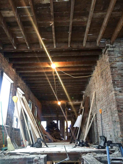 38 S Russell was constructed with brick and timber; most of the floor joists were spruce wood. As a part of the rehab process, all of these original spruce joists are removed and replaced with new LVL joists to quickly and economically meet code requirements.
