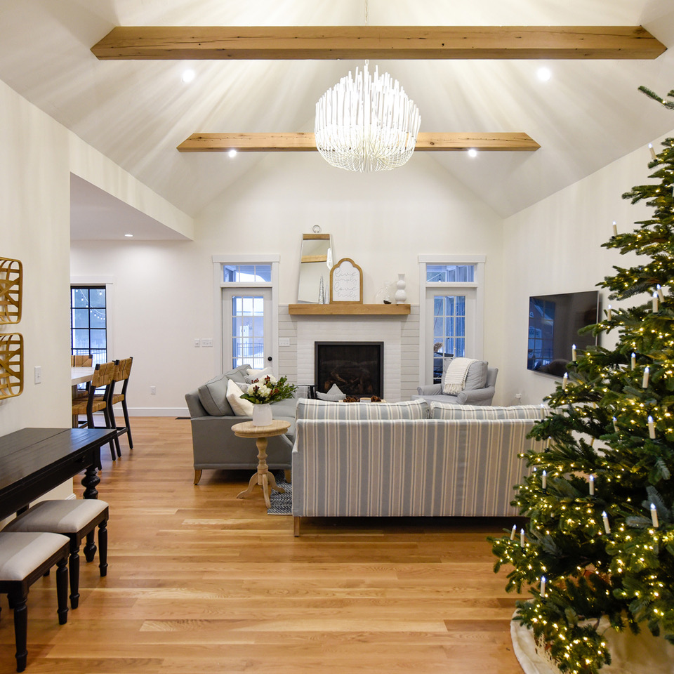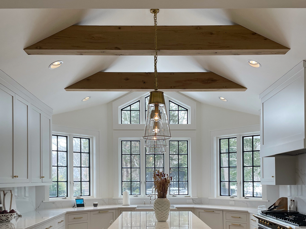 Boxed beams are a great way to add a lighter-weight visual accent to a ceiling or to hide plumbing and wiring. We mill surfaced reclaimed lumber that can be installed on site with mitered edges. The last image here is just one example, installed with expert craftsmanship.