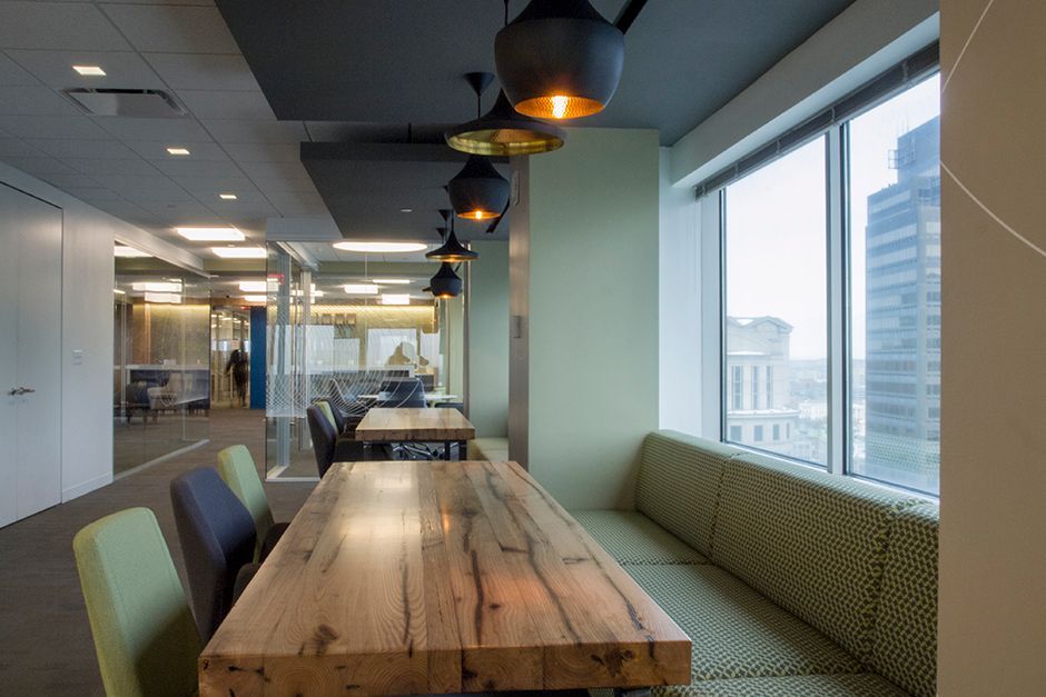 Reclaimed American chestnut tables built for an insurance company in downtown Boston. Custom welded steel bases. 12/4″ tabletop thickness.