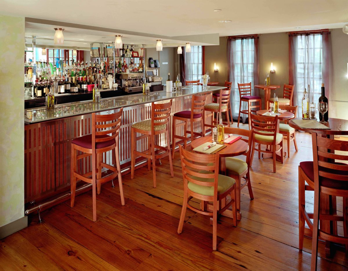 Reclaimed Heart Pine flooring for restaurant and bar Red House in Harvard Square, Cambridge, Massachusetts. Mixed-width tongue-and-groove flooring.