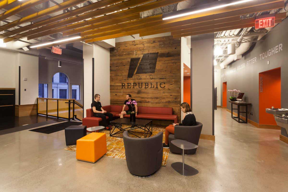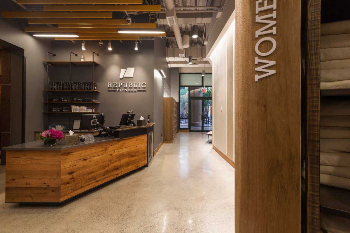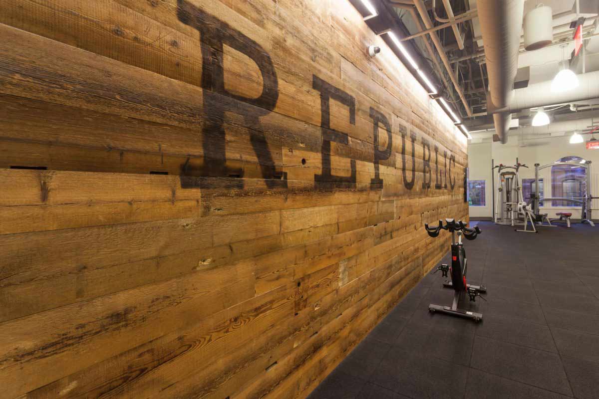 Reclaimed wood flooring, paneling, stair parts, benches, and tables for Boston’s Republic Fitness.