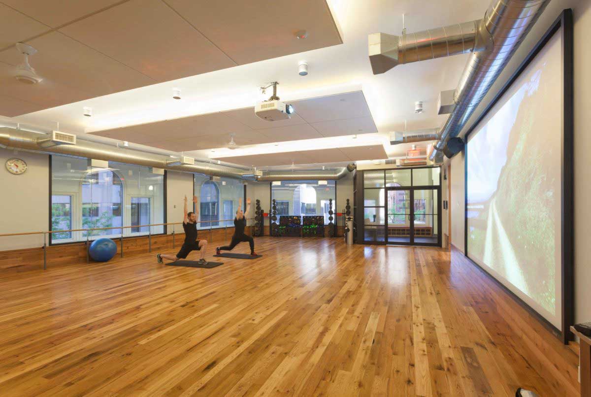 Gym room and entryway walls paneled with reclaimed wire-brushed spruce salvaged from the W.B. Mason headquarters in Brockton, MA. Yoga room floor solid plank reclaimed red and white oak flooring with complementary trim.
