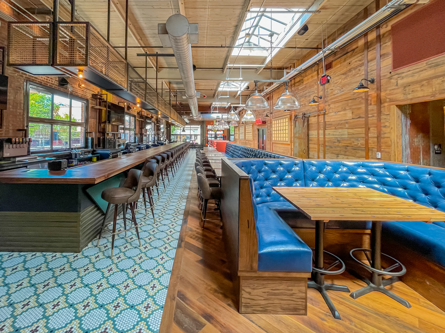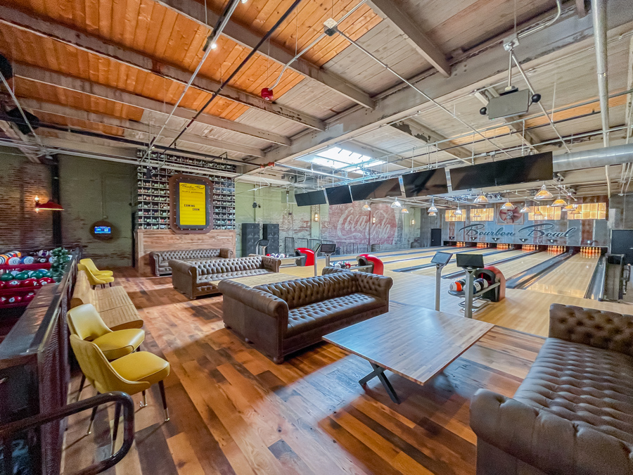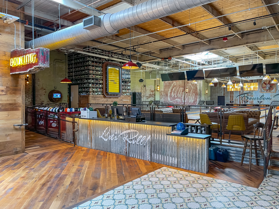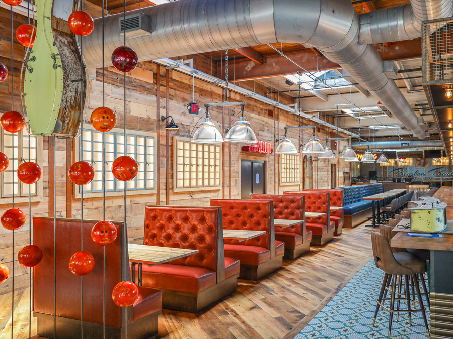 Reclaimed wood was right up Bourbon Bowl’s alley when their Greensboro location was designed. Salvaged tin, skip-planed oak wood flooring and wire-brushed softwoods paneling, and lots of exposed structural elements add to the energy of this space. Throw in great food and some bowling and you’re really on a roll.