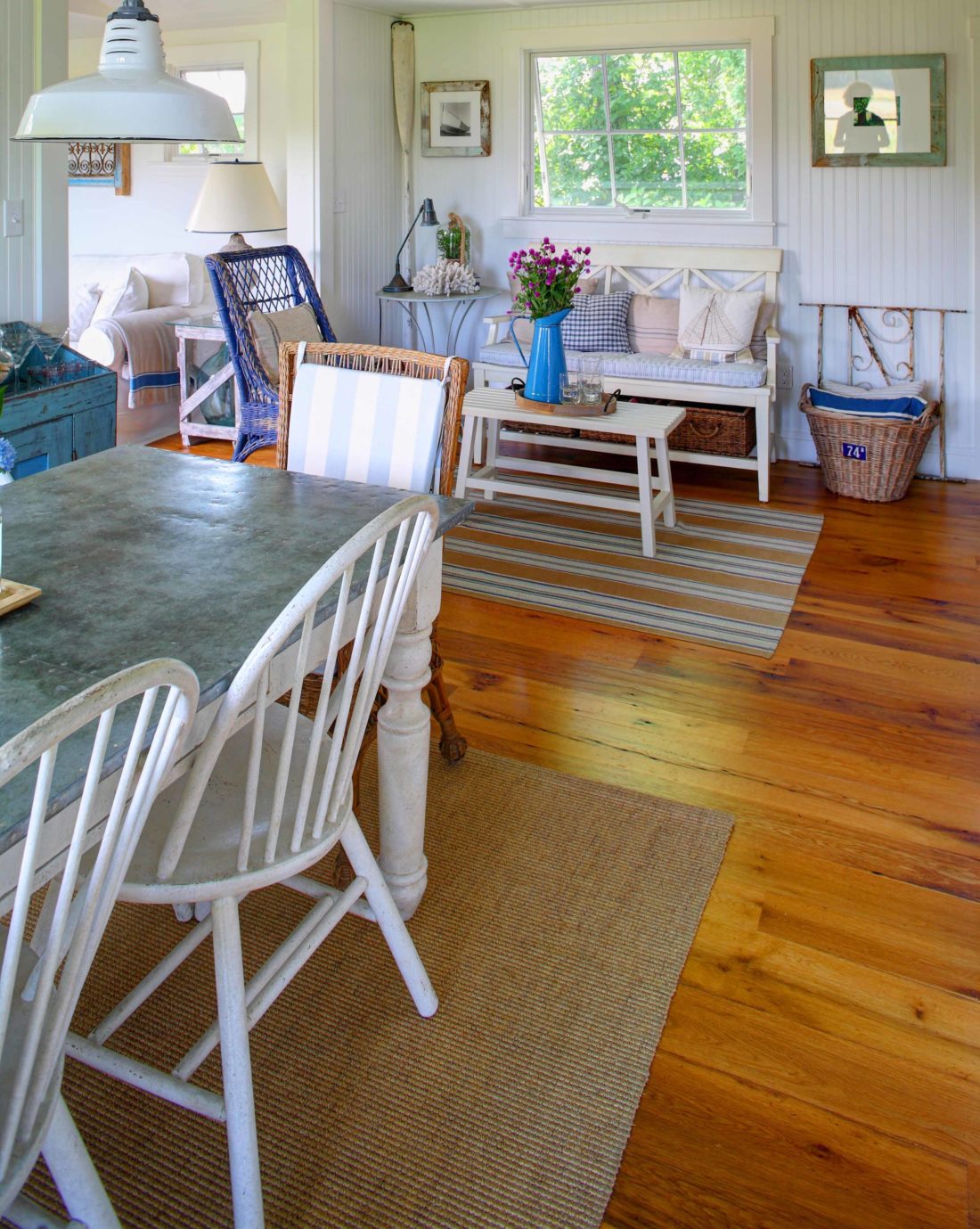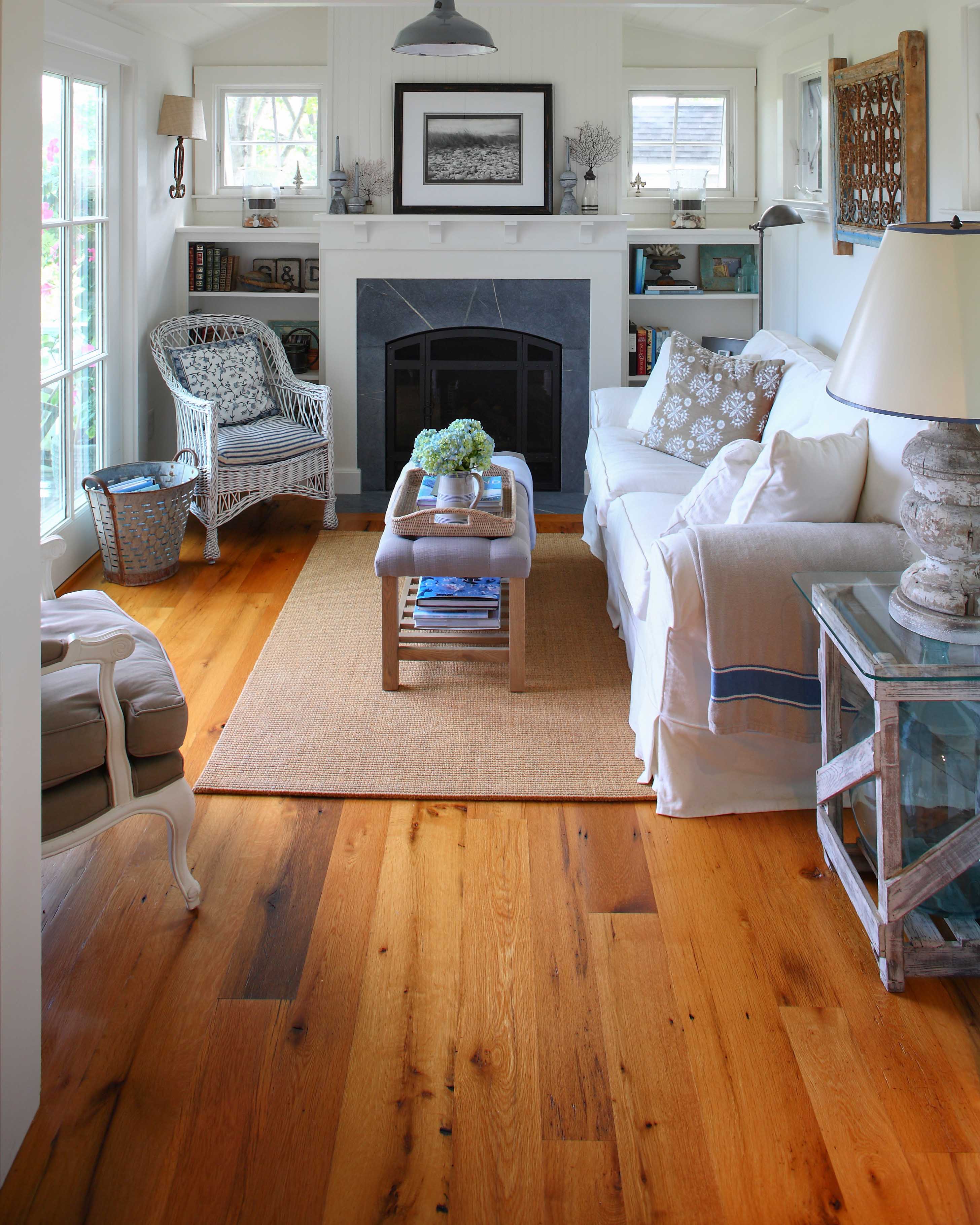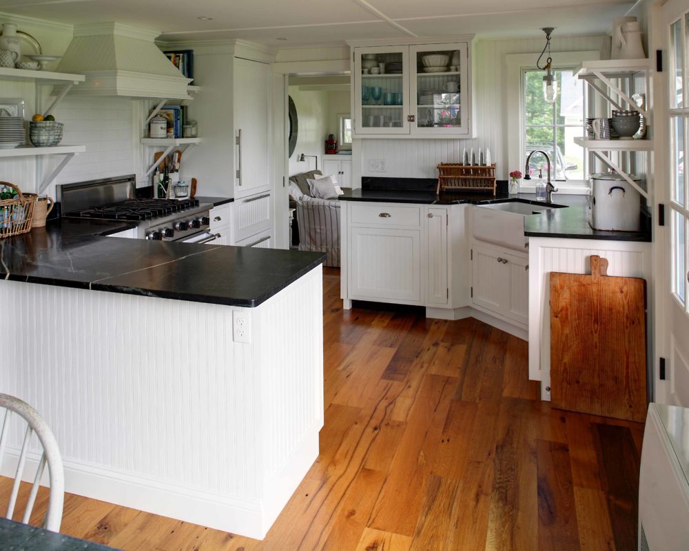 Reclaimed white oak flooring in plank widths from 4″ to 7″ were used throughout the first floor of this coastal Maine home. The floors were finished with an oil-based polyurethane.