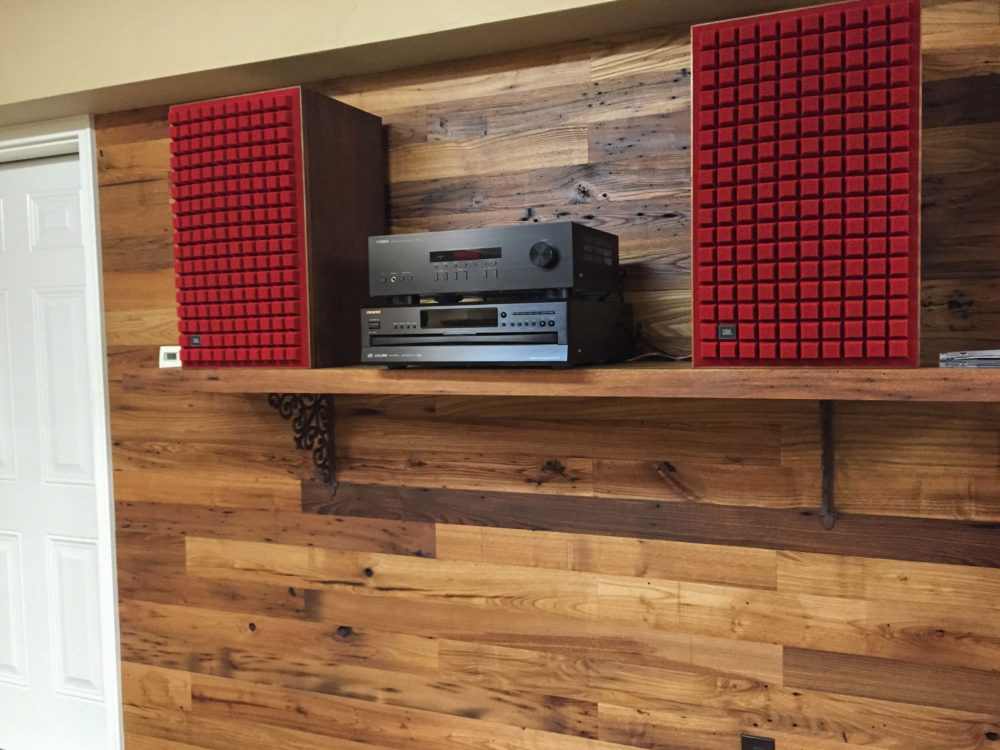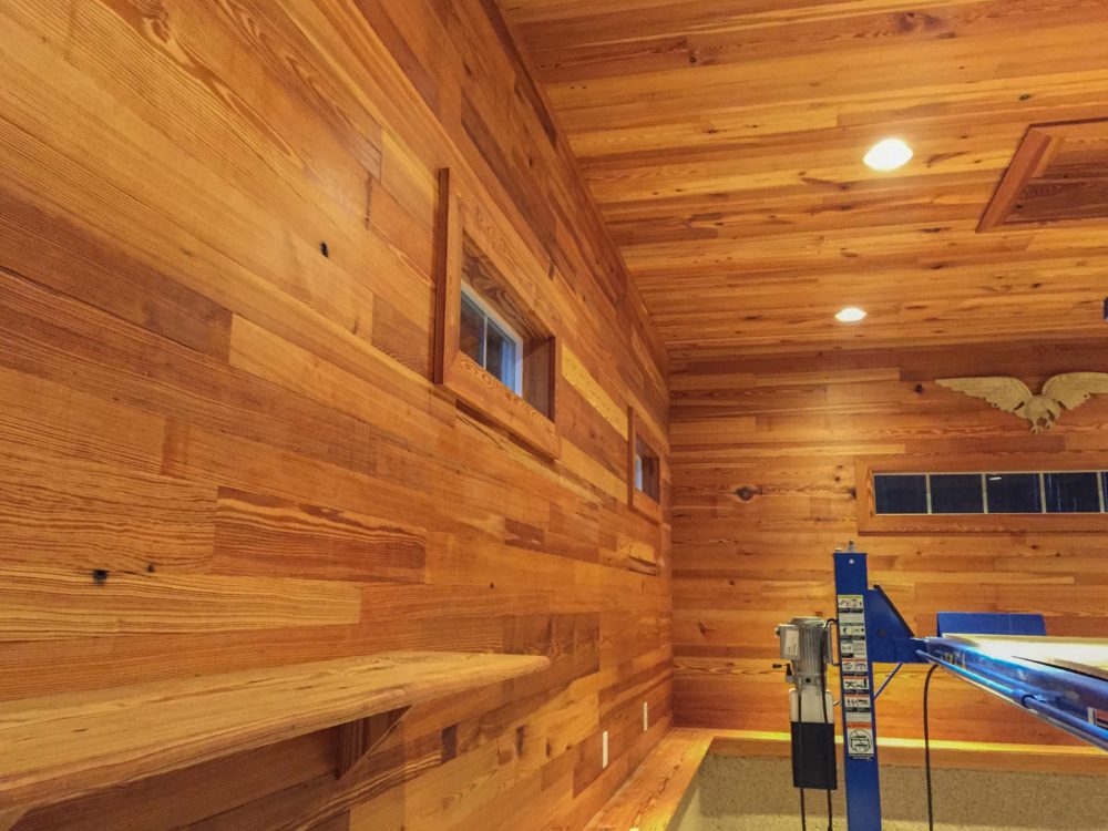 This Massachusetts garage uses reclaimed Heart Pine and reclaimed American chestnut paneling for walls and ceilings. Paneling boards are milled tongue-and-groove in mixed widths.
