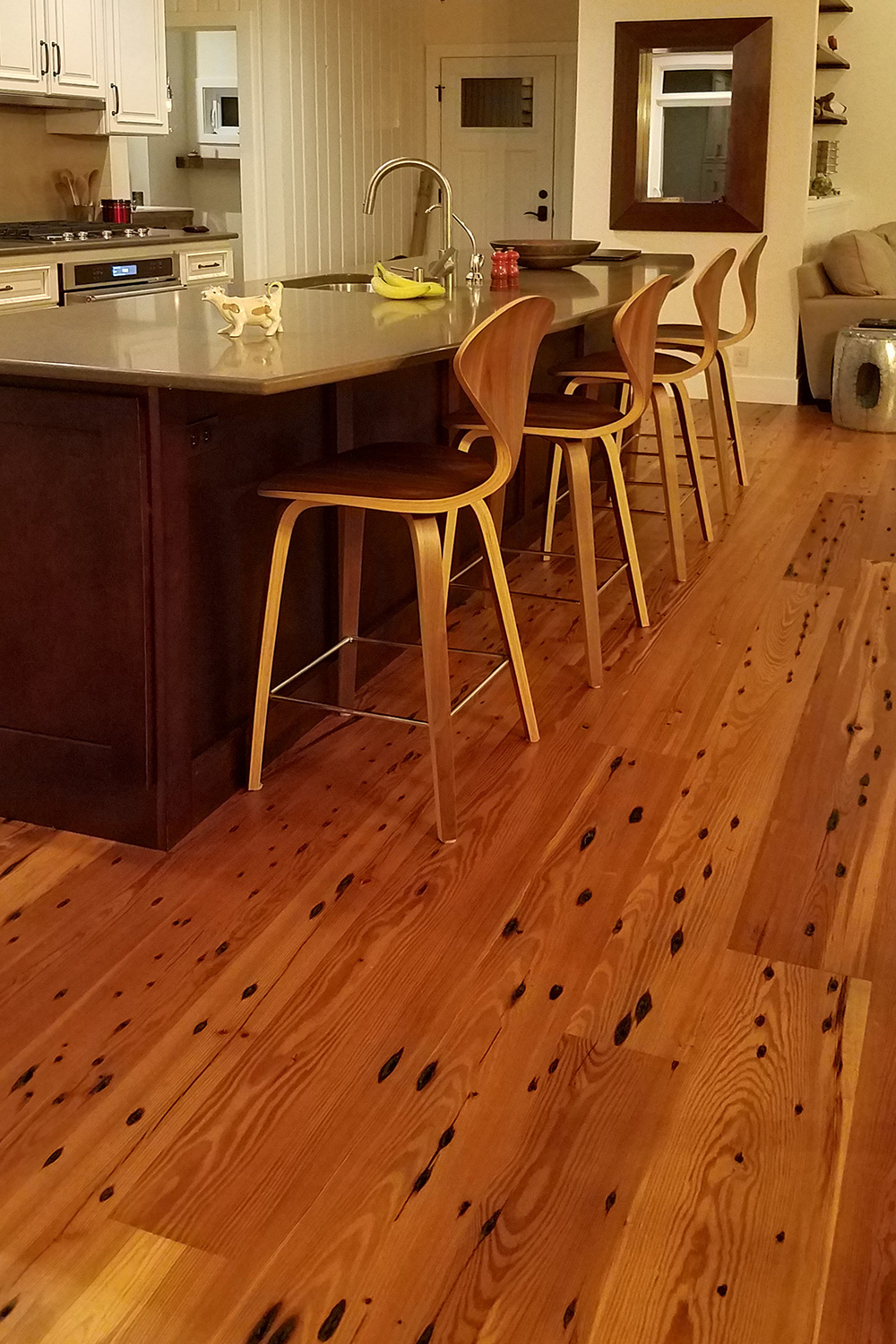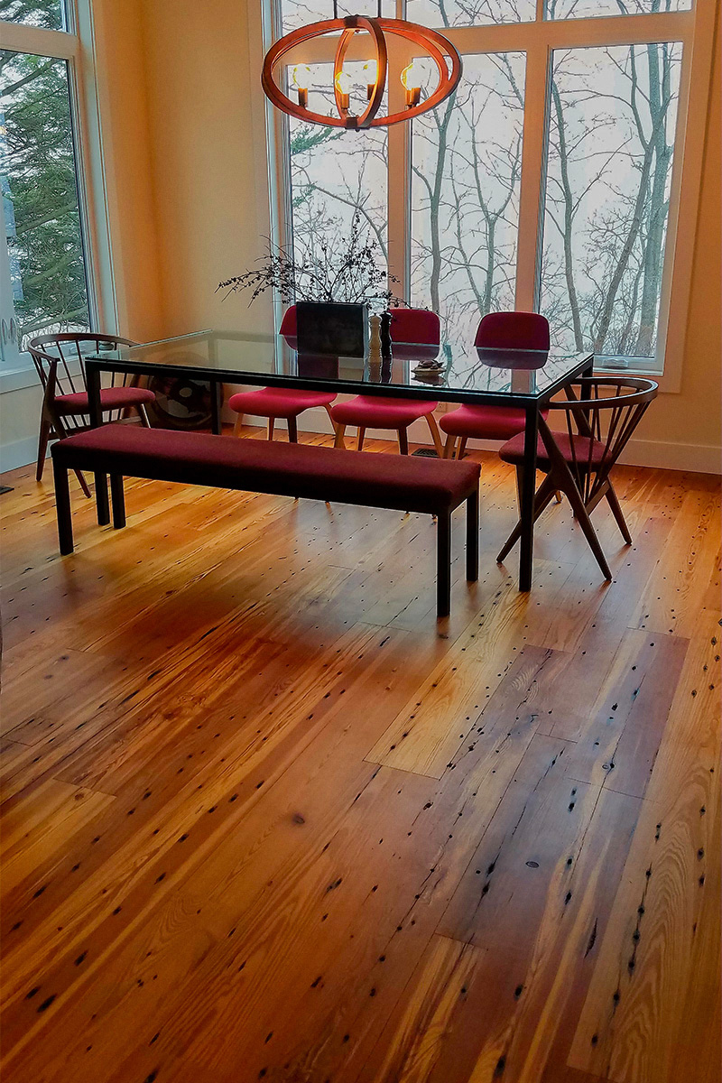 Reclaimed Naily Buckshot Heart Pine flooring was installed throughout this lakeside home. The modern interior and rustic nail hole pattern of the flooring complement each other nicely. Floors finished with Waterlox tung oil.