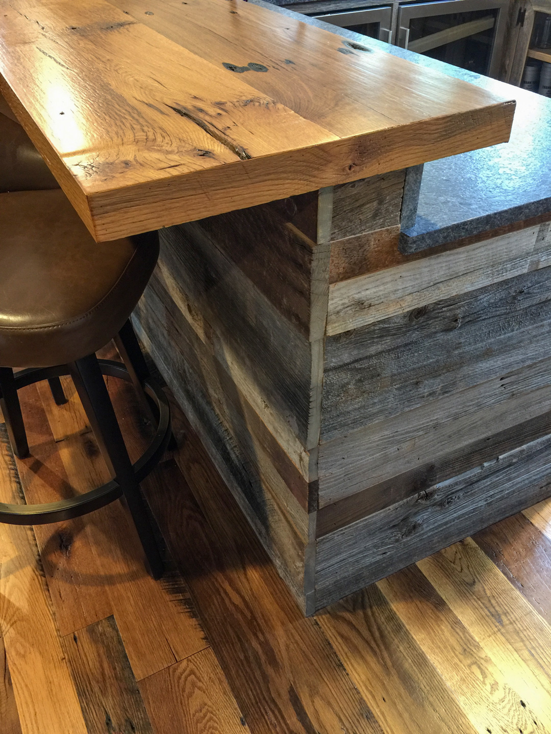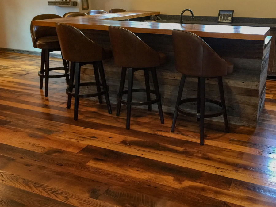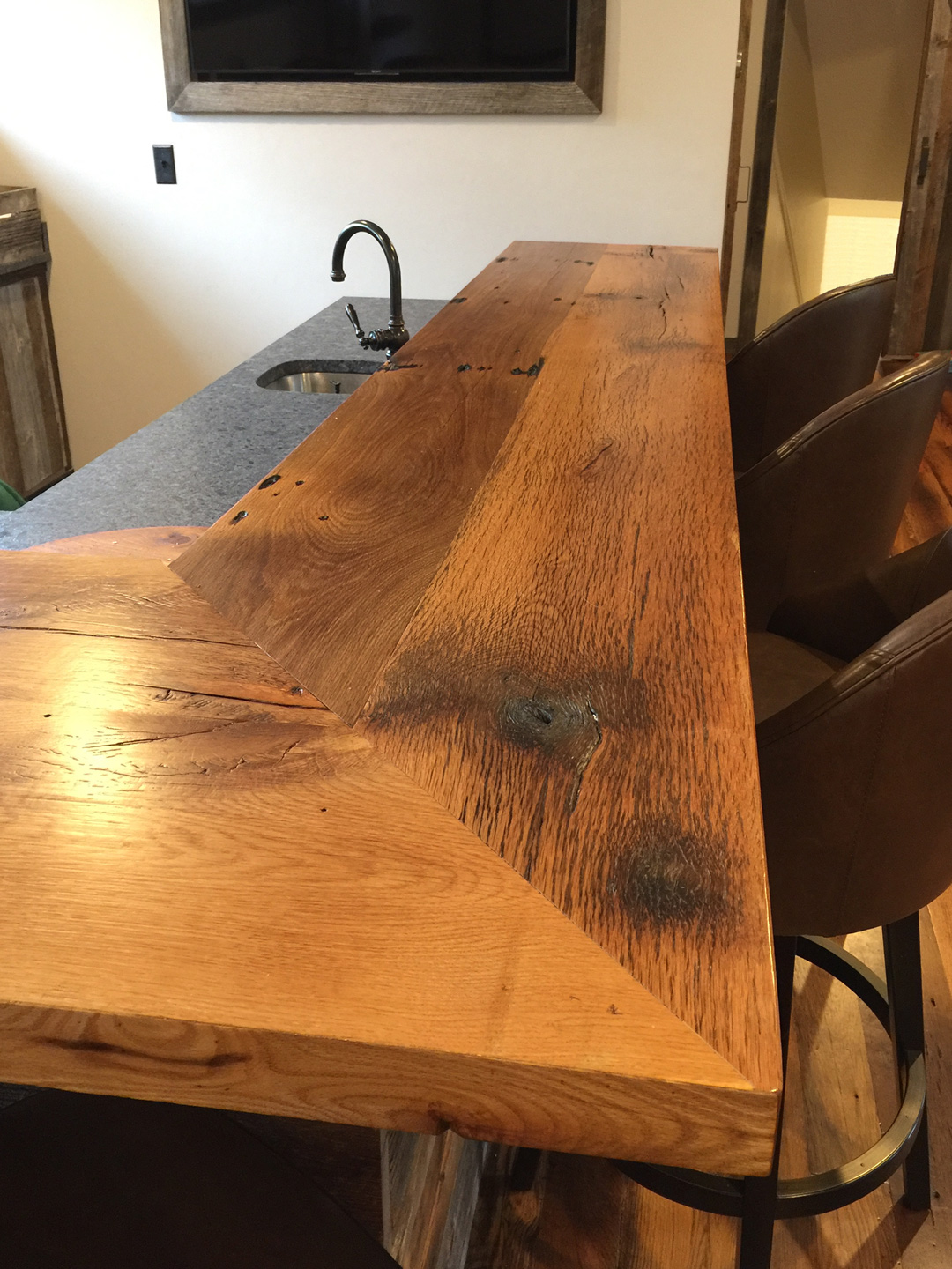 Reclaimed skip-planed oak flooring was chosen for this family room in a home just west of Cambridge. Salvaged barn board clads the bar which is topped with more oak, expertly-joined to suggest a heavier thickness.