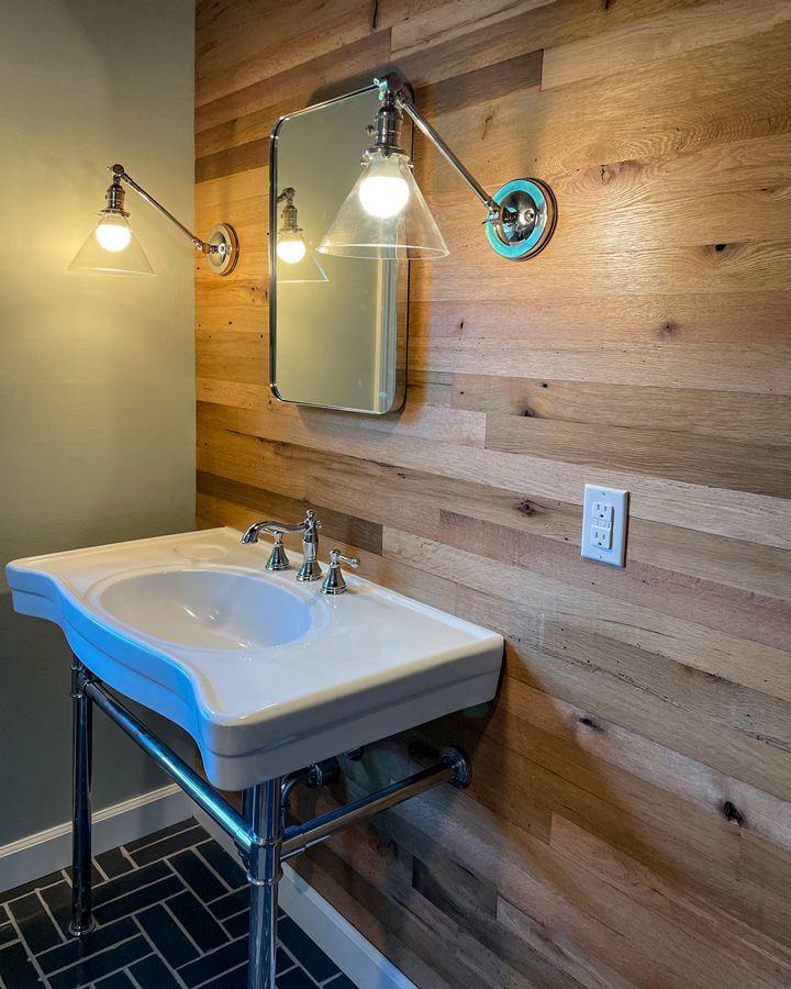 Reclaimed red and white oak paneling, half inch thick, on the wall in this home. A nice warm balance to the white color and tile on the floor. Looks great finished with Vermont Naturals.