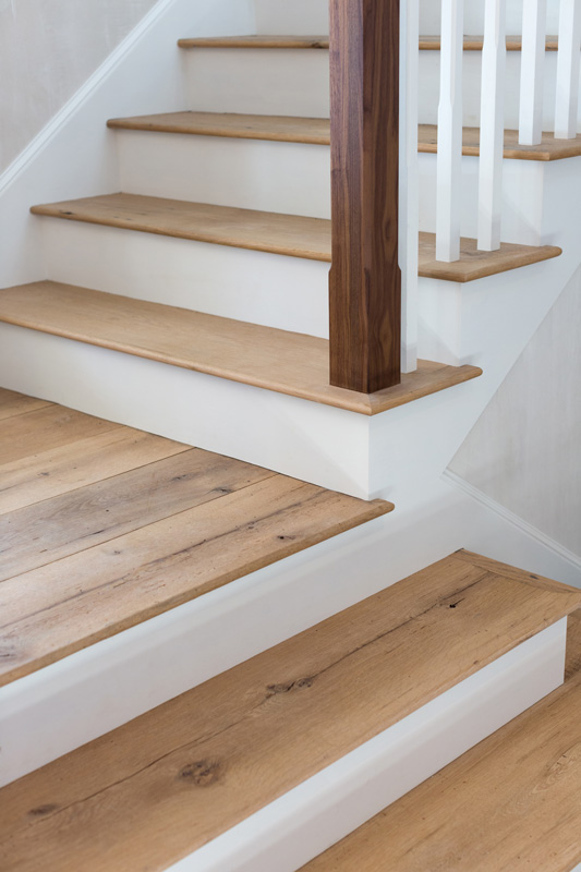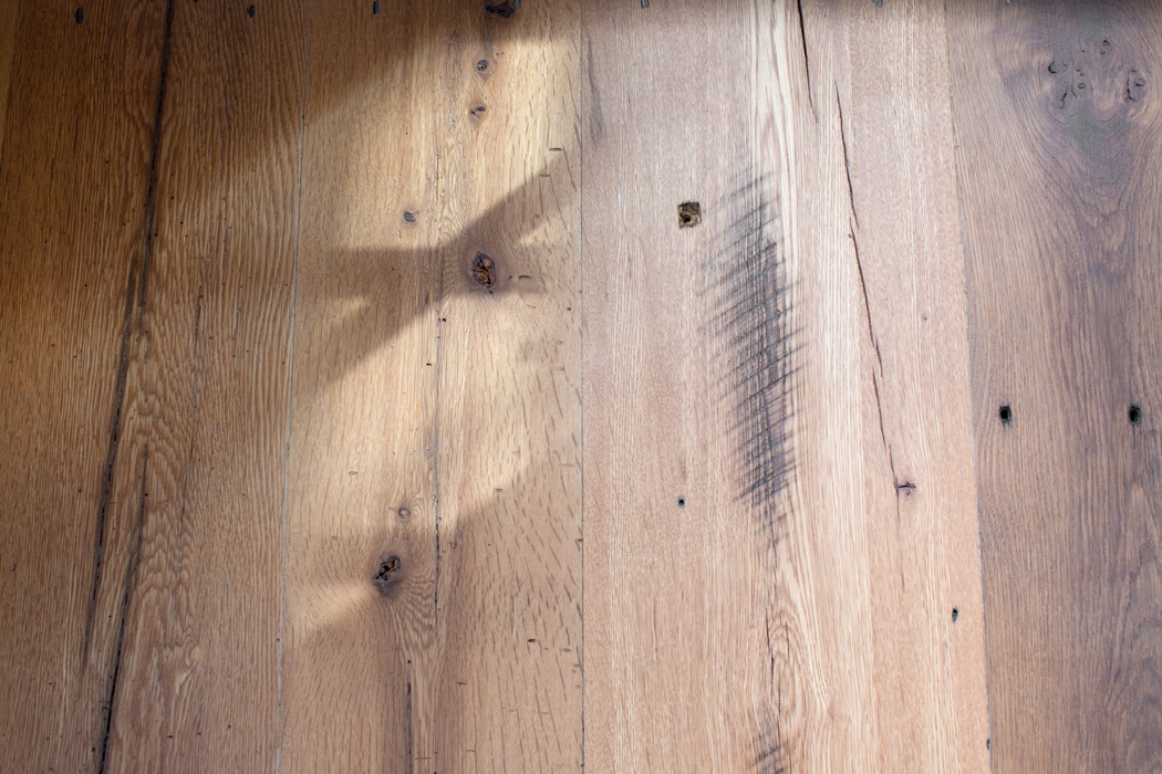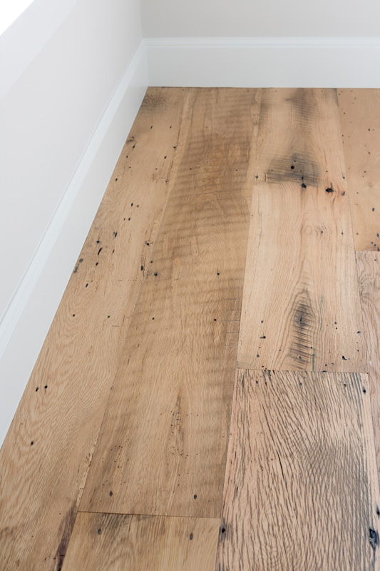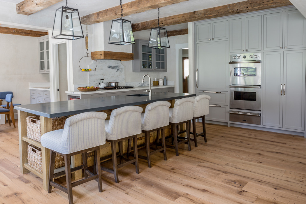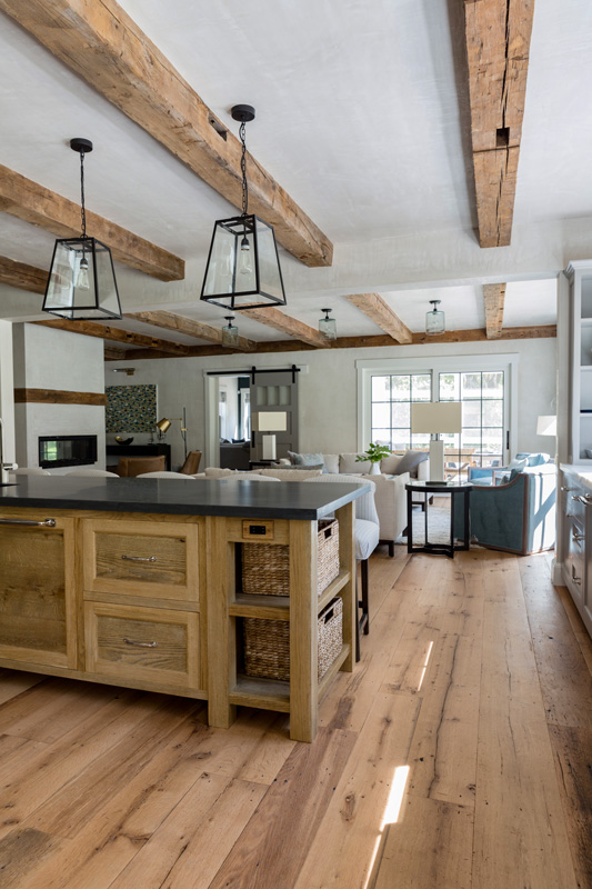 Antique hand-hewn beams grace the ceiling and reclaimed white oak with a water-based finish takes comfortable command of the floor in this private home. Photo: Lisa Vollmer Photography