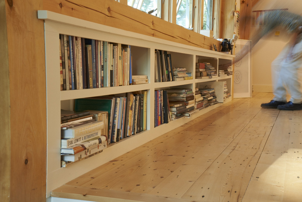 Reclaimed bright spruce flooring in a converted barn. Mixed-width boards, face-nailed with a water-base finish. Painter’s studio, Yarmouth, Maine.