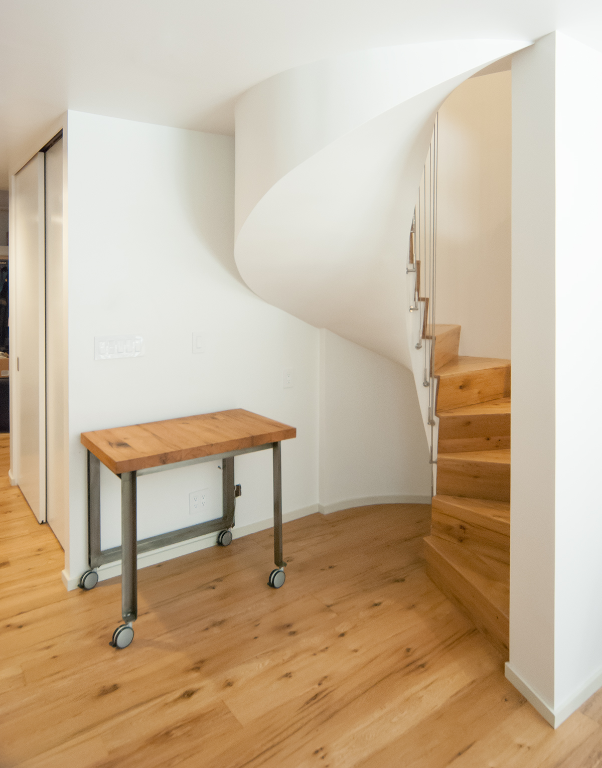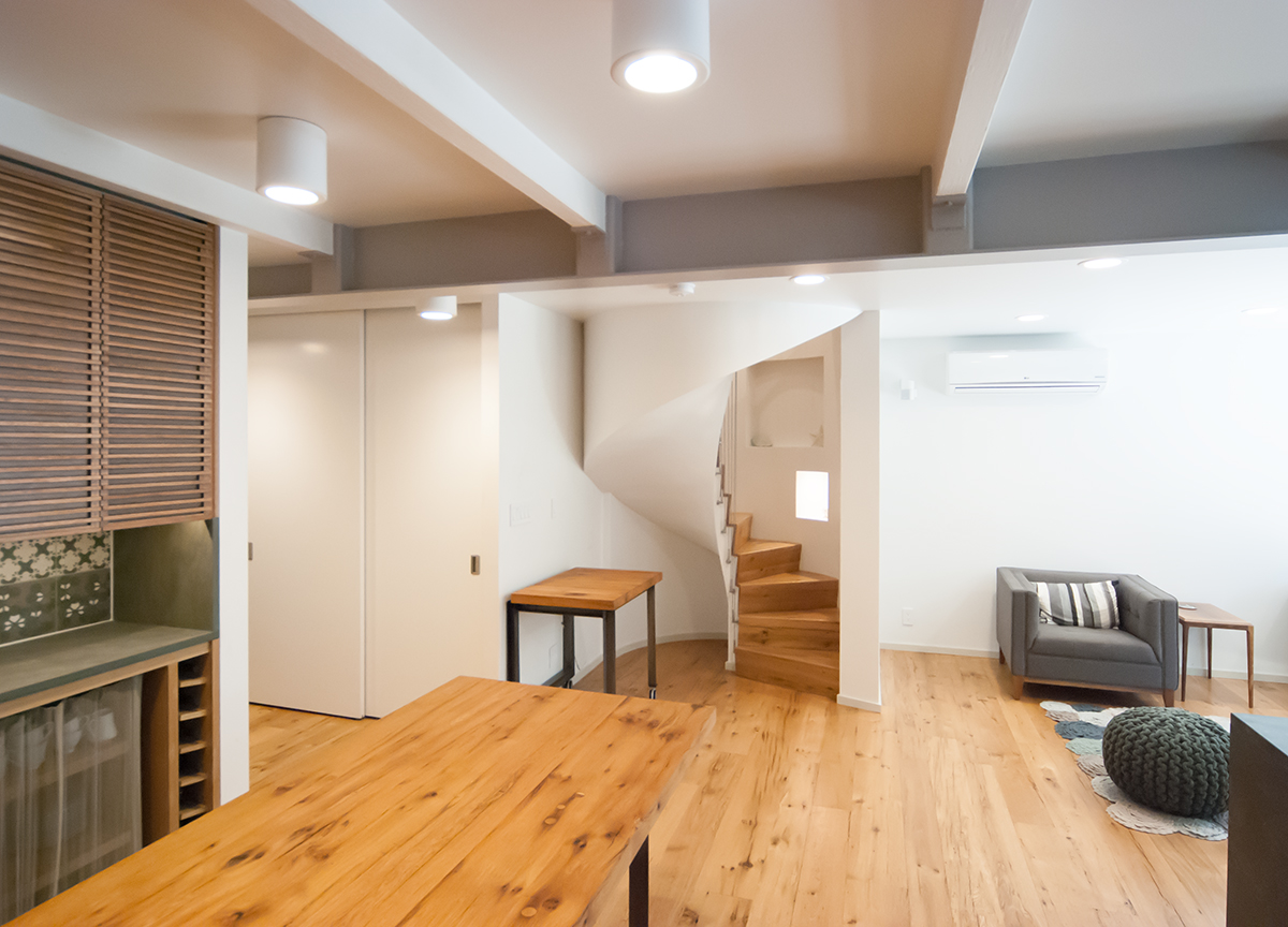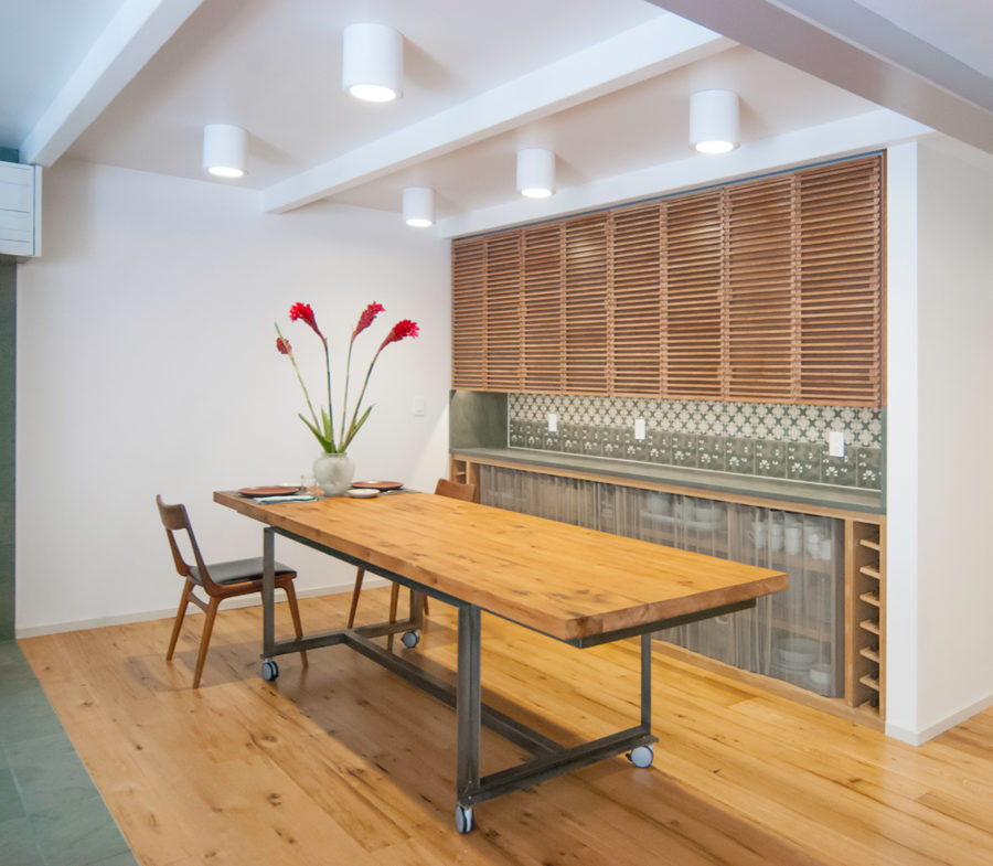 Reclaimed white oak flooring and tabletops for a Brooklyn, NY apartment. A mixed-width floor in 3-1/4″ – 8-1/2″ planks. Finished with Bona Mega Clear HD satin. Design by Reverse Architecture