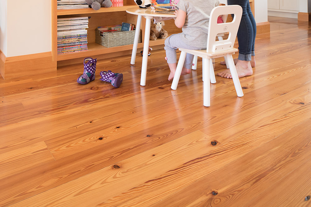 Select Grade Flatsawn Heart Pine was used throughout this New Hampshire home: on the floors, for treads and staircase inlays, and as wainscot paneling. Finished with oil-based polyurethane and topped with a final coat of epoxy.