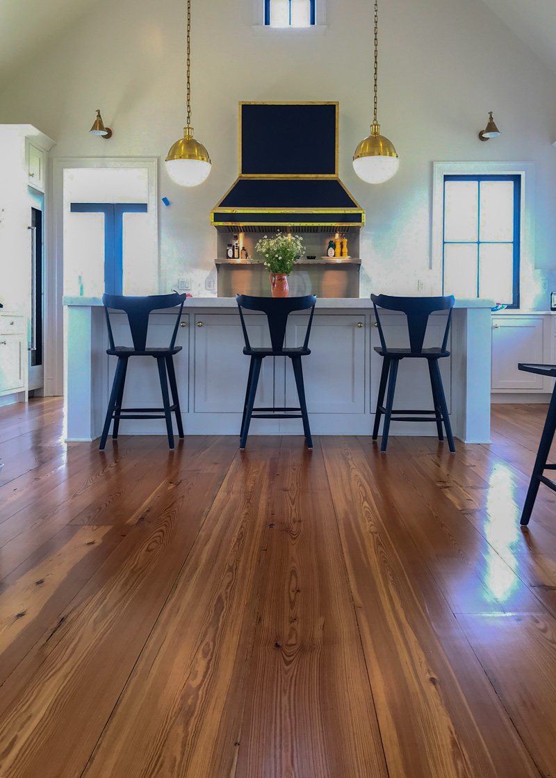 Wide reclaimed Heart Pine flooring was chosen for this comfortable and elegant home in Maryland. Flooring was finished with clear satin polyurethane.