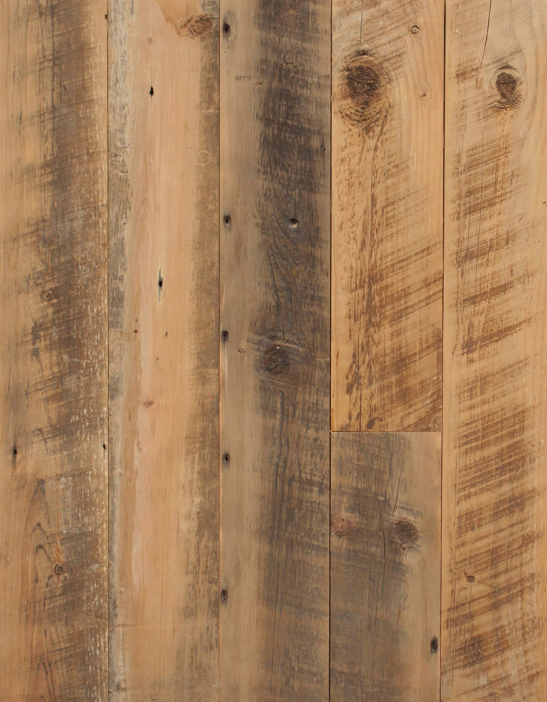 This paneling is a mix of reclaimed softwoods that can include Eastern White Pine, hard pine, hemlock, and spruce salvaged from mill buildings and barns. These woods usually have a lighter color and will exhibit some light checking, occasional nail holes, and knots scattered across the boards, making this a rustic but bright paneling reminiscent of industrial loft spaces and casual farm houses. These unpretentious reclaimed woods provides an ambiance of warmth and comfort offered by few other species.