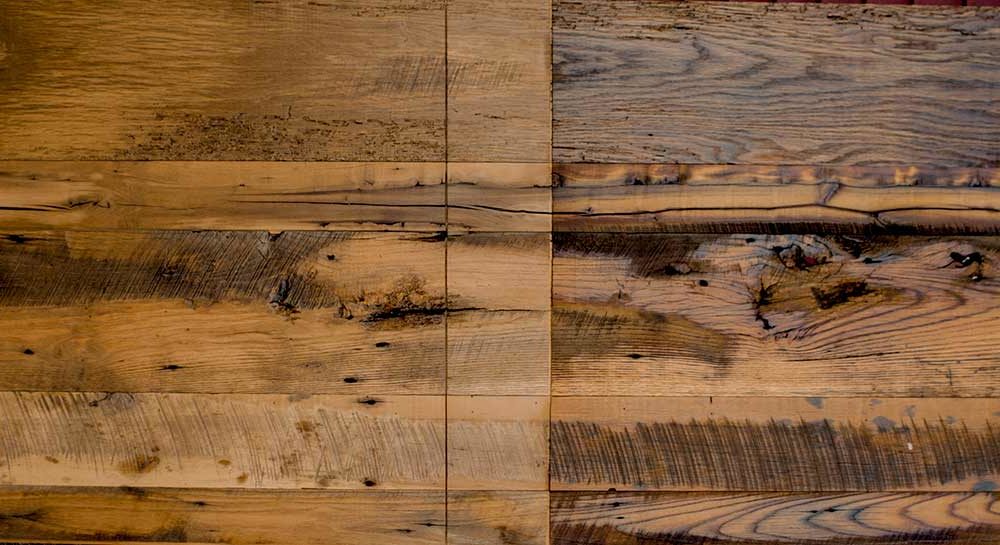 Our skip-planed mixed hardwoods paneling includes beech, maple, elm, hickory, poplar, and other hardwoods. As we planed these antique boards, we allowed some of the original patina to remain, including rustic features such as saw marks and original distress.